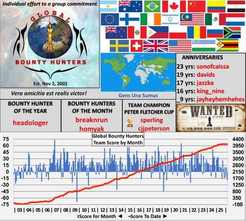 | Description: | ![]() Global Bounty Hunters is an internationally based team, founded in November, 2002. We strive to create and maintain long term relationships among our members and with our opponents. Our current members have been with the team an average of 12 years and played over 580 team games. Now spanning 27 countries on 6 continents. The sun never sets on the Bounty Hunters!! Global Bounty Hunters = Global Friends The hunt is on…Let’s Go Bounty Hunters! OUR TEAM OBJECTIVES: Laugh, learn, have fun, make friends, improve. Individual effort to a group commitment - that is what makes a team work, a company work, a society work, a civilization. If you are interested in joining the hunt, please contact our captain bevo_xv. Preference given to paid members. To increase the diversity of the team, preference will also be given to players representing non-US countries. Links: Postpone your games: gameknot.com Change maximum team games: gameknot.com Change days per move: gameknot.com BOUNTY HUNTER OF THE YEAR 🏆 2003: terrabull ______ 2004: phish_phan, bevo_xv 2005: phish_phan ___ 2006: drron 2007: panga74 ______ 2008: hexs 2009: sbu180 _______ 2010: mambo240 2011: anomalocaris __ 2012: smallphish 2013: smallphish ____ 2014: michaelflynn 2015: sambunny _____ 2016: pat-a 2017: tiktaalik _______2018: pat-a 2019: rooftiler _______2020: pat-a 2021: pat-a _________2022: pat-a 2023: pat-a_________ 2024: menenius 2025: headologer BOUNTY HUNTER OF THE MONTH 🏆 _________2026:______________________2025: January___breaknrun, homyak__________munichtyke February____________________________ronlumm, rambler57 March_______________________________rambler57 April________________________________breaknrun, howling_canine May_________________________________breakerofwind June________________________________growthrings, harleydude, ramcik July_________________________________rooftiler August_______________________________howling_canine September____________________________munichtyke October______________________________rooftiler November____________________________geminiii December_____________________________geminiii Other individual achievements and awards have been moved to the Team Forum, Team Notes thread. gameknot.com |